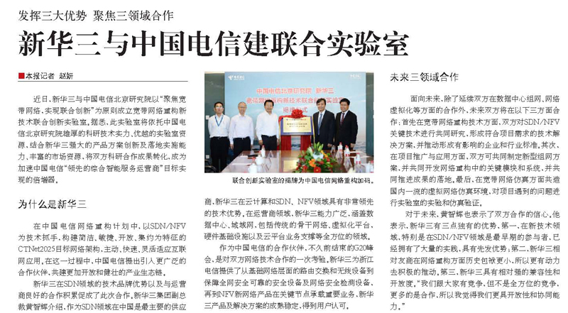 發(fā)揮三大優(yōu)勢(shì) 聚焦三領(lǐng)域合作 新華三與中國電信建聯(lián)合實(shí)驗(yàn)室(《通信產(chǎn)業(yè)報(bào)》)